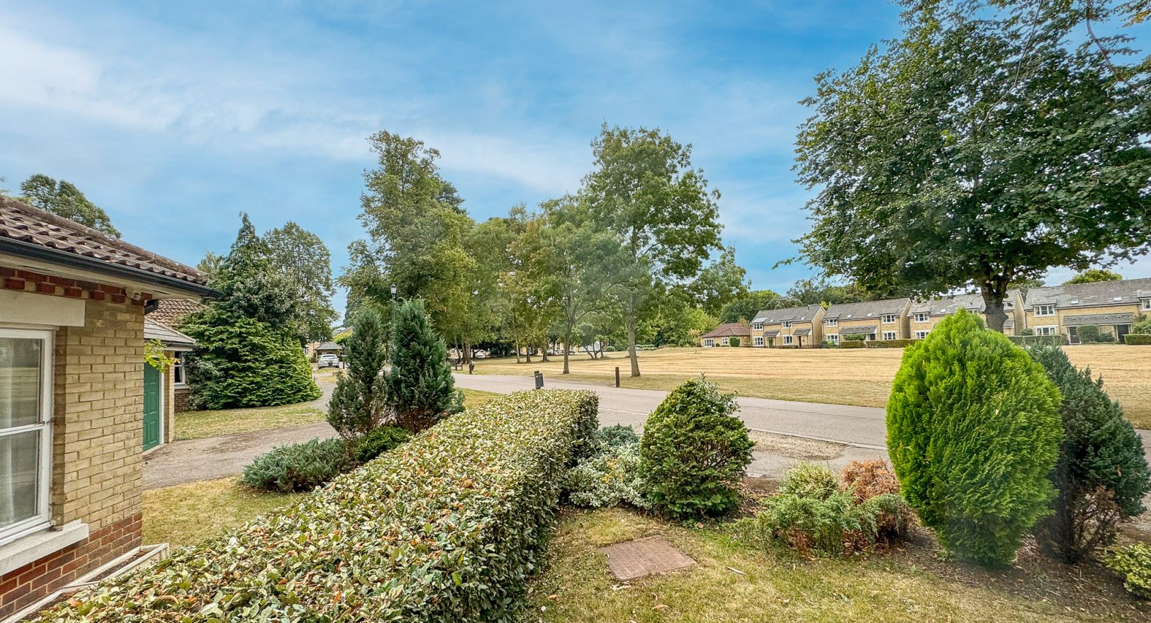 Semi-detached bungalow on a corner plot. Entrance hall, living room with views of the wildlife meadow, dining room with window to side aspect, re-fitted kitchen with appliances. Bedroom one with fitted wardrobes, en-suite shower room and garden room leading to a private patio area. Bedroom two also overlooks the wildlife meadow and there is an additional family shower room.