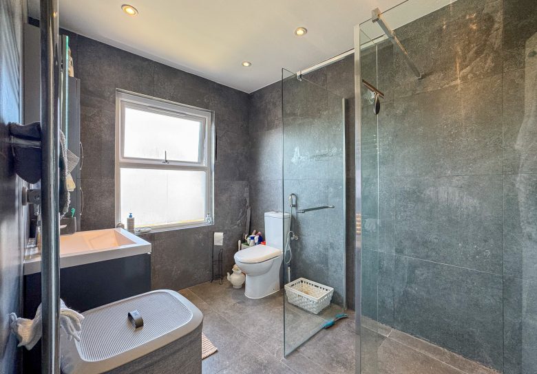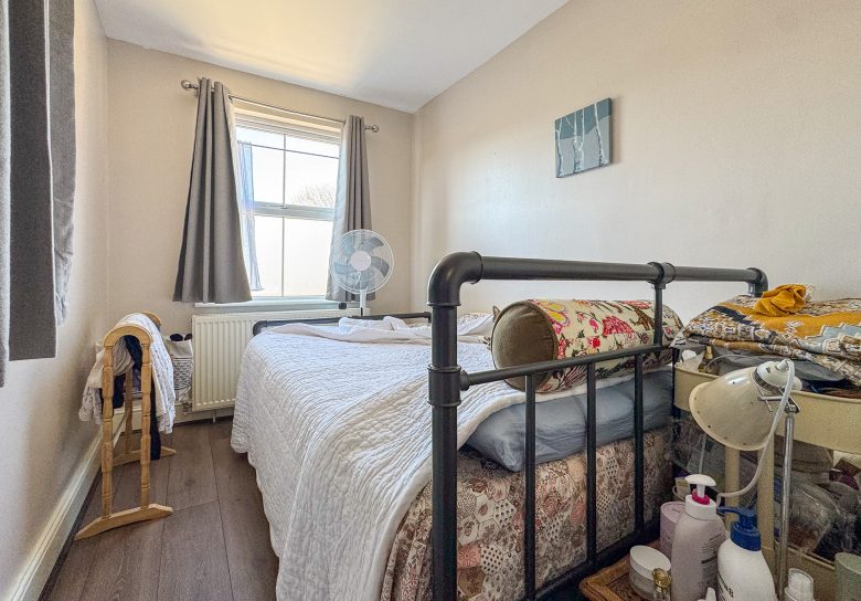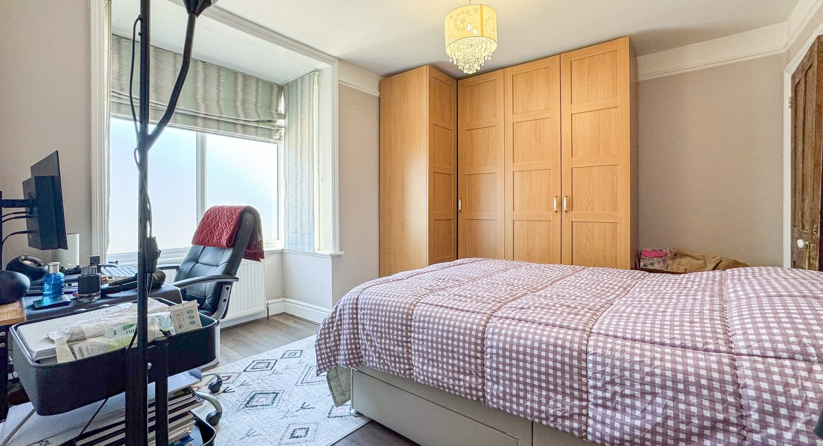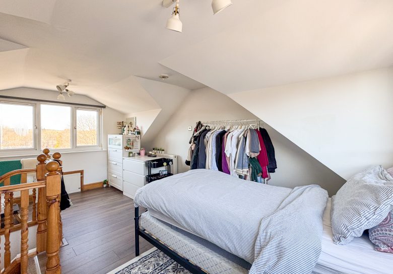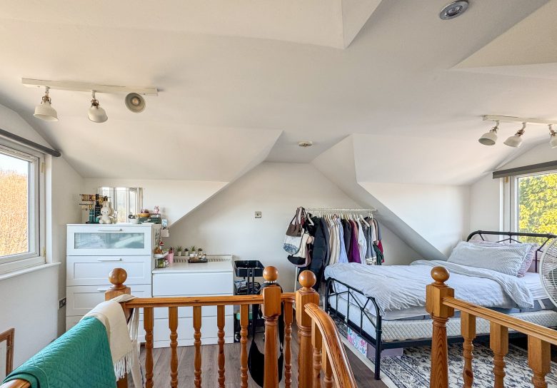 To the upper floors, there is a generous double bedroom with a bay window, dressing area and built-in wardrobes, a contemporary family shower room, and on the second floor a further spacious double bedroom with dual-aspect windows and elevated views.