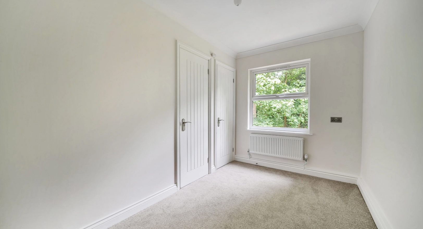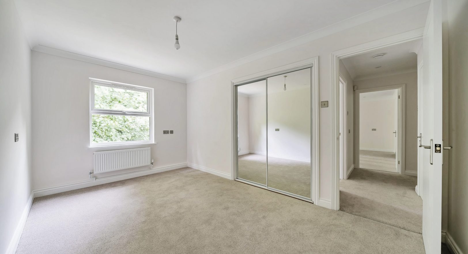 A bright and well-presented refurbished two bedroom apartment located in Woodland Place. The accommodation comprises an entrance hallway with utility cupboard housing a washer/dryer, a bathroom with bath and shower attachment, and a spacious living room with Juliette balcony enjoying views over woodland. The fully fitted kitchen includes brand new integrated appliances, including a dishwasher. The master bedroom benefits from an en suite shower room, and there is a further second bedroom.